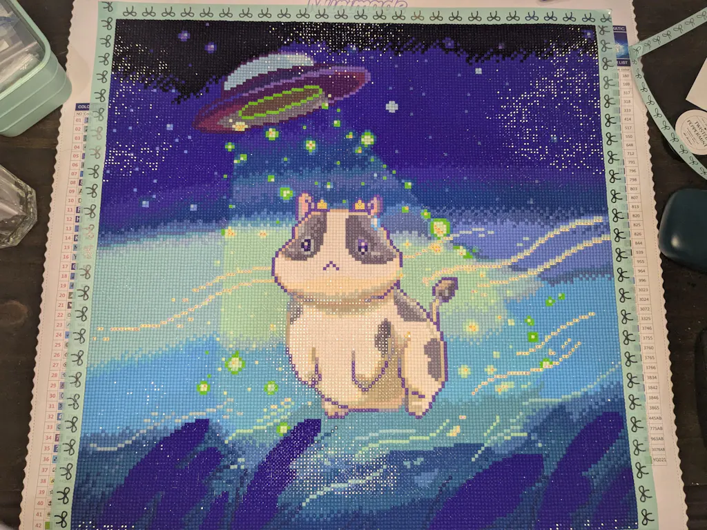 First purchase from Munimade. Definitely will not be my last!Great quality overall (great rendering, great drills)!! As for the image itself, I couldn't resist this cow image; it's too cute!
